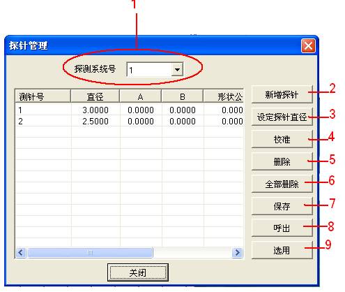 1 探测系统号:因为在一台机器上,有可能使用多个测头系统。如既有可能使用旋转测头,又有可能使用星型测头,来解决较为复杂的工件的测量。因此可能使用探测系统号来区分各个测头系统。软件Zui多支持10个探测系统。