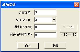 在这个对话框里,用户输入探针的名义直径。然后再探针选择一个探针号。并输入探针的仰角和水平角。(这个在星型测头和旋转测头都会用到)。然后点击确定按钮,新增加一个探针。